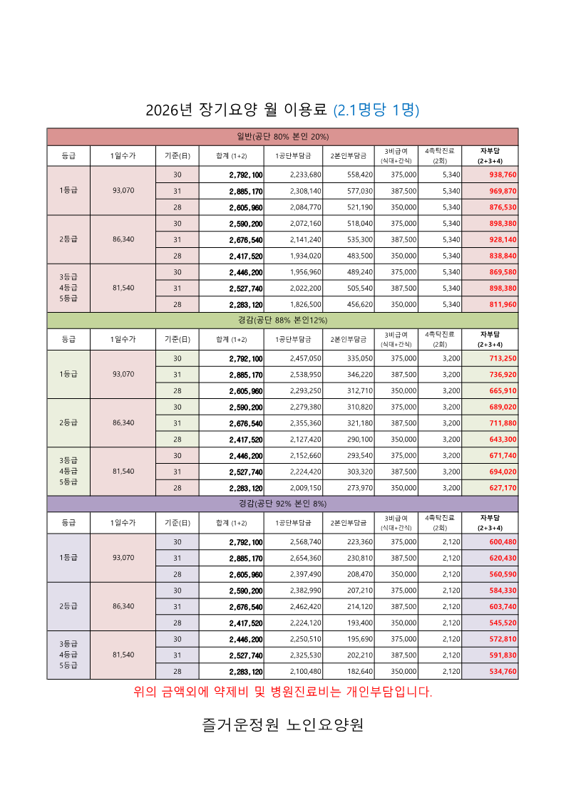 2026년 즐거운정원노인요양원 월 입소이용료 (안내)